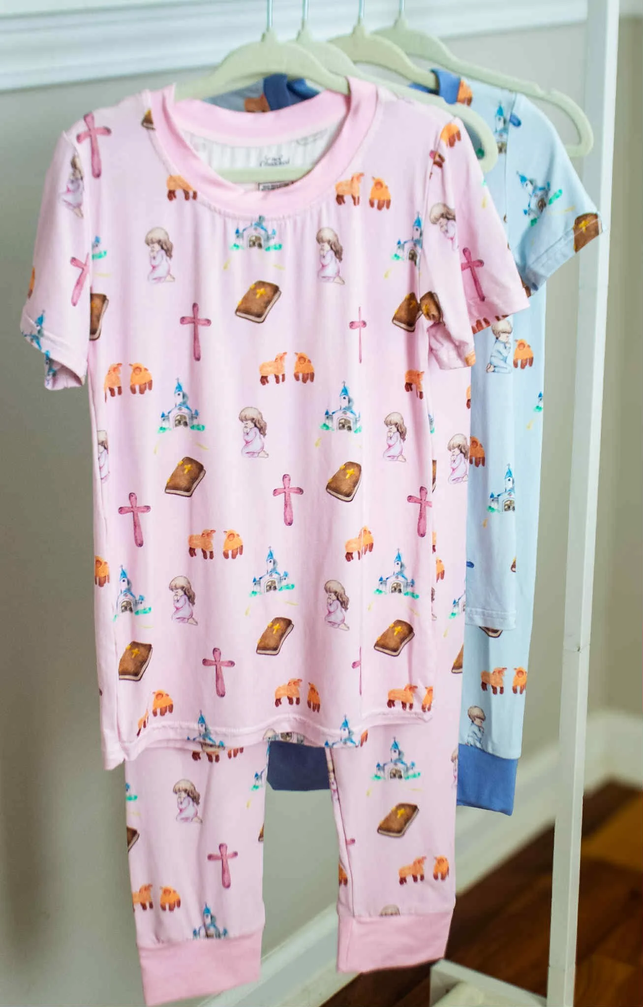 The Little Boy Blessings Bamboo Collection is a timeless favorite for faith-filled families. Featuring watercolor icons of a praying boy, Bible, church, and lambs, this classic blue set makes every day feel like a Sunday morning. Crafted from our signature buttery-soft bamboo viscose for stretch, comfort, and breathability. Pairs perfectly with our Little Girl Blessings Collection for matching sibling sets.